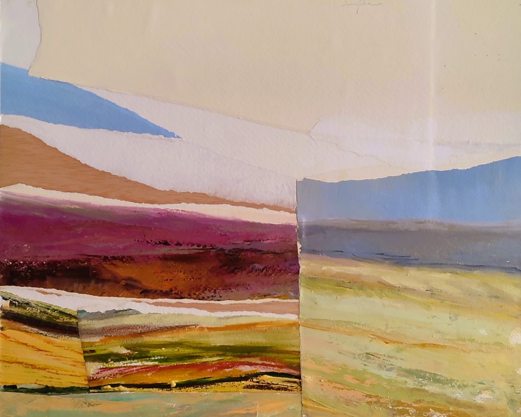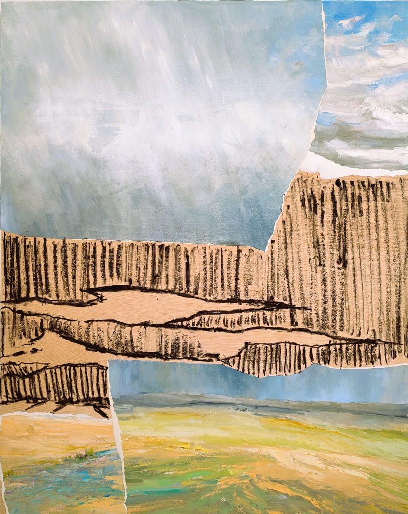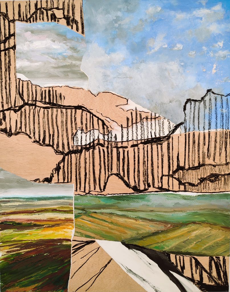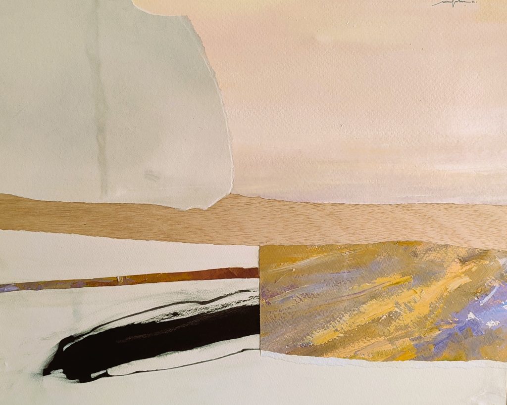 El cariño por el papel y utilizarlo de soporte para algunas obras viene por mi formación en grabado durante la carrera. De hecho, el grabado sigue siendo un buen y viejo amigo. Que mi obra actual esté o siga vinculada al papel no es casualidad. Con el collage y el marouflage disfruto la parte del juego, del puzle, de encontrar la pieza que encaja y cierra la composición. Estas técnicas me permiten disfrutar de la ruptura, de la imperfección, del papel en sí mismo, sus texturas y fibras forman parte activa de la estructura de la obra.